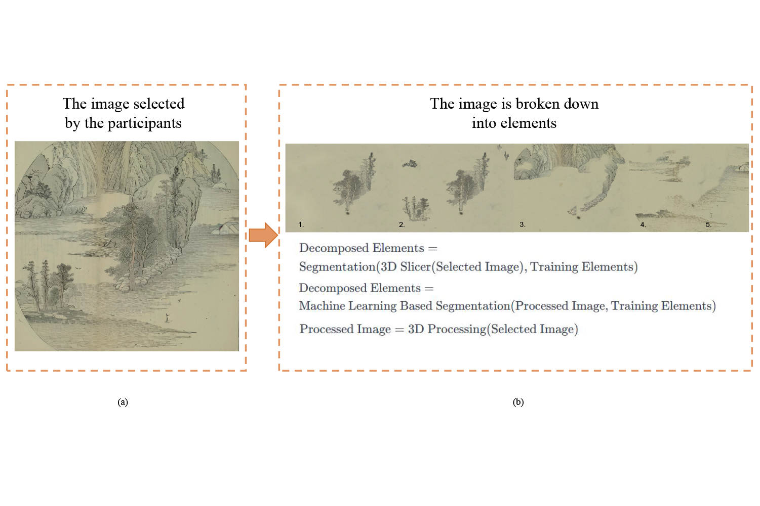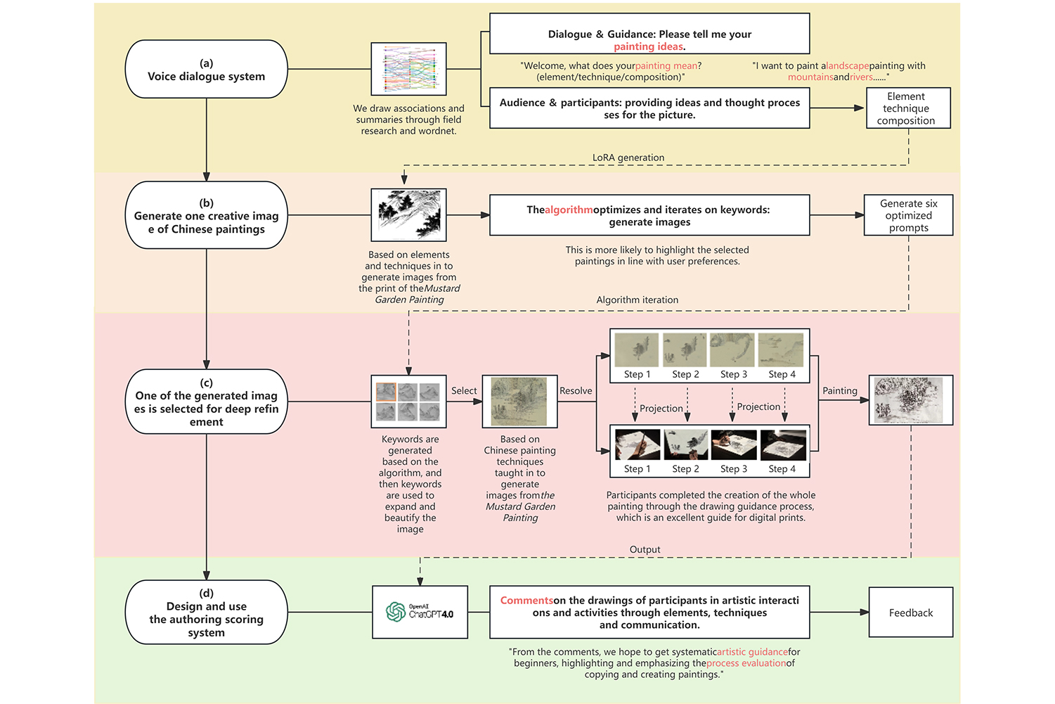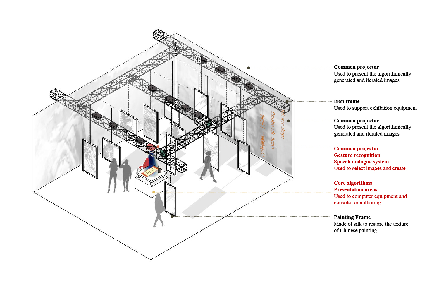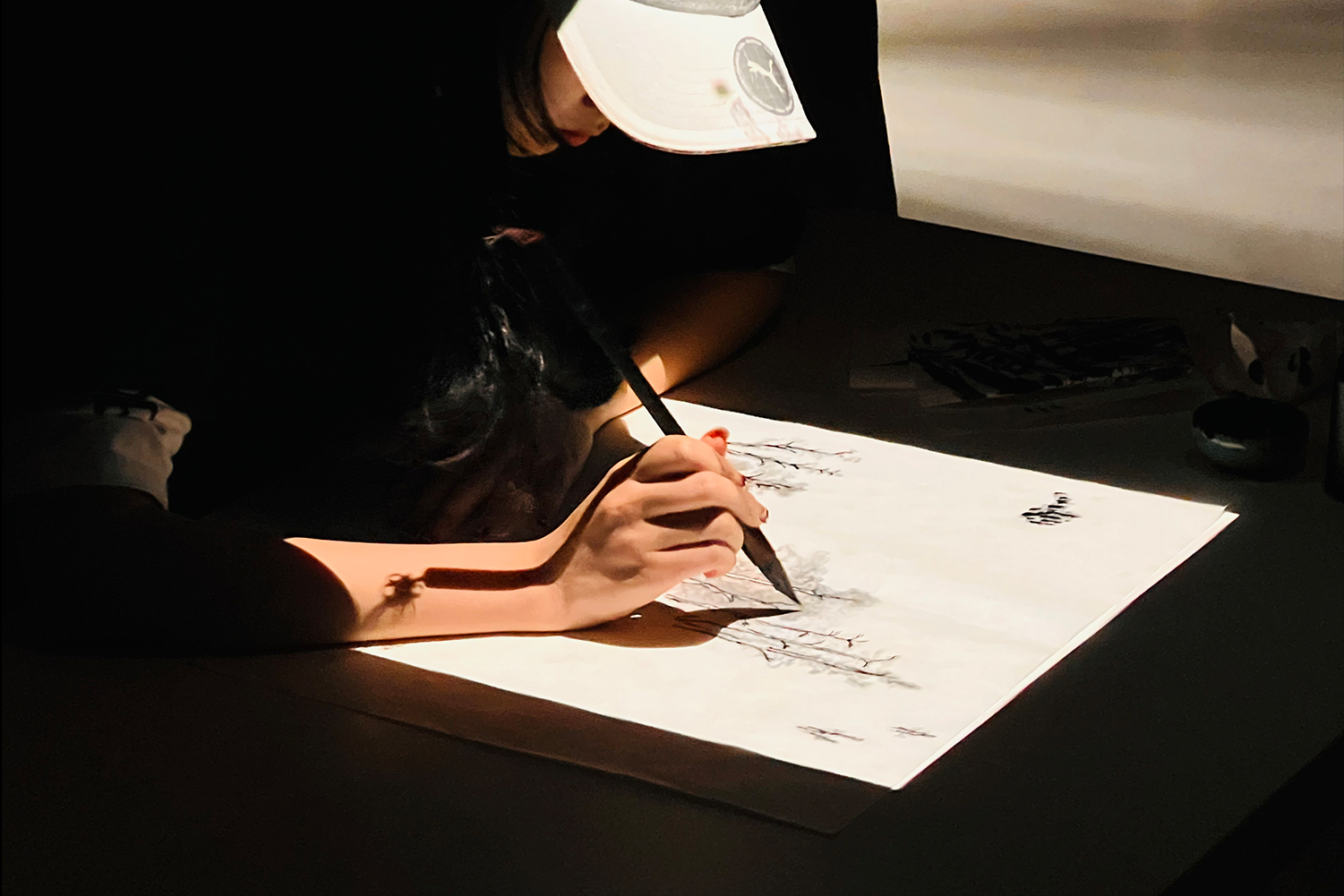 Through audience participation, the model generates digital prints, transforming viewers into active participants. By merging classic and contemporary techniques, our installation offers new mediums for exploration and novel ways for audiences to engage with art, promoting a deeper appreciation and understanding of traditional art forms. This interactive approach enables beginners to learn basic ink painting techniques through personalized content, guided by digital technology, making the learning process more accessible and enjoyable.